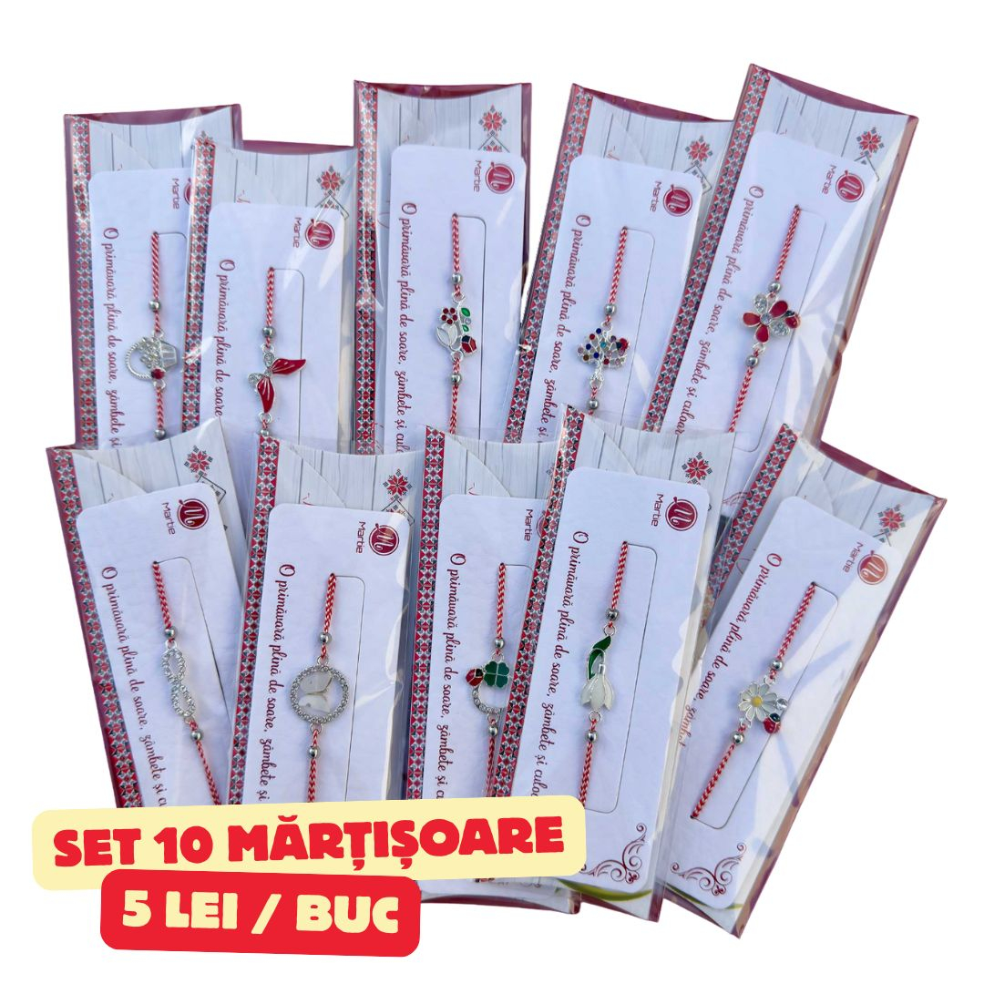 Dacă ai un salon sau un business și vrei să impresionezi fără să depășești bugetul, acest Set 10 este soluția rapidă: alegi o singură dată și ai brățări variate, gata de oferit clientelor sau echipei. Firul alb-roșu păstrează tradiția, iar pandantivele adaugă farmec și personalitate. E genul de Mărțișor care se vede, se simte și se poartă – exact ce îți dorești pentru perioada de Primavara.