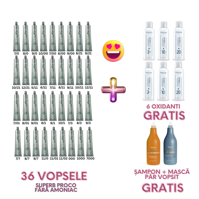 Piesa centrală a setului este selecția de vopsea de păr profesională din gama vopsea fără amoniac SUPERB de la PROCO / PRO.CO, în tuburi de 100 ml, fabricate în Italia. Formula fără amoniac, cu vitamine din grupul B, este gândită pentru colorare permanentă cu acțiune delicată, iar gama include nuanțe foarte utile pentru serviciile comerciale din salon.