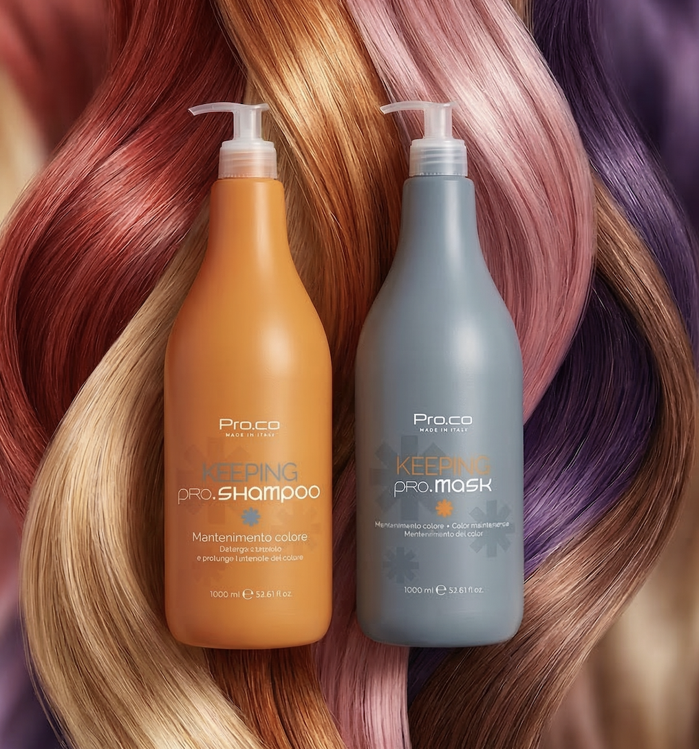 Gama KEEPING de la brandul italienesc PRO.CO este special concepută pentru întreținerea părului vopsit. Acestea hrănește, hidratează, etansând cuticulele părului pentru a preveni descărcarea culorii și a-i prelungii intensitatea.